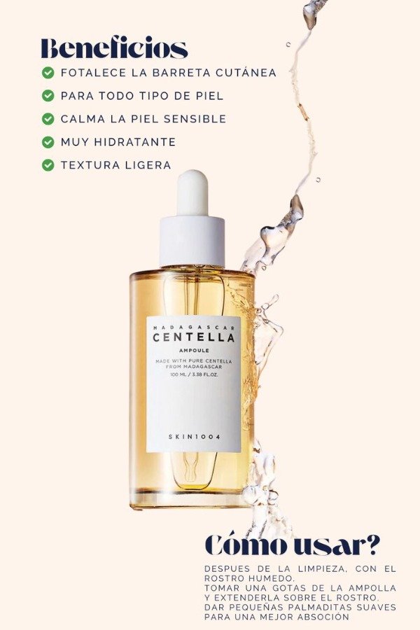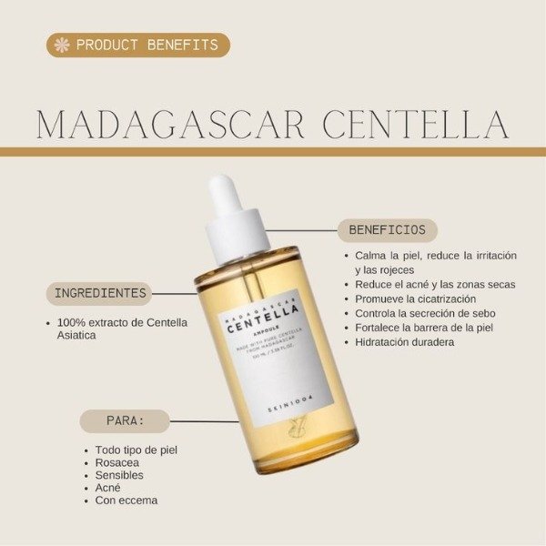 Esta novedosa ampolla está elaborada con 100% de extracto de Centella Asiática, proveniente de la naturaleza virgen de Madagascar. Hidrata, suaviza, calma y purifica la piel.